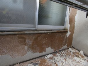 モルタルは、建物のちょっとした寸法の調整や、手摺壁の天端によく用いられています。経年変化により、躯体から分離してしまうと、その部分が浮いて見えます。