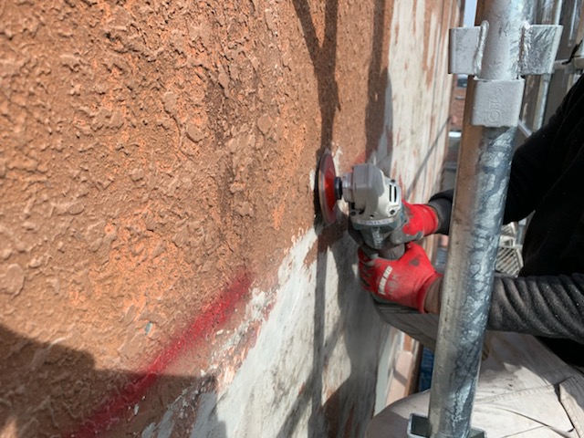 浮いているタイルをチェックしてサンダーで目地を切りタイルを剥がしていきます。