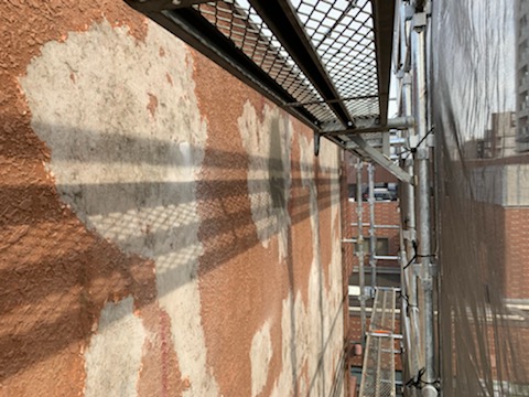 只今外壁の下地補修作業を進めております。