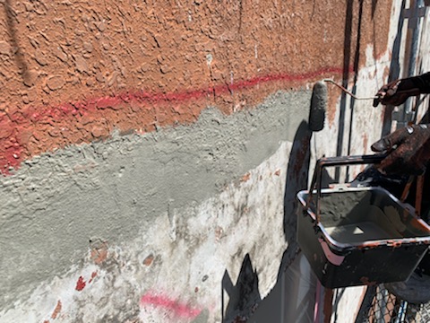 剥離した塗膜端部はカチオンモルタルを薄塗して段差を少なくしておきます。