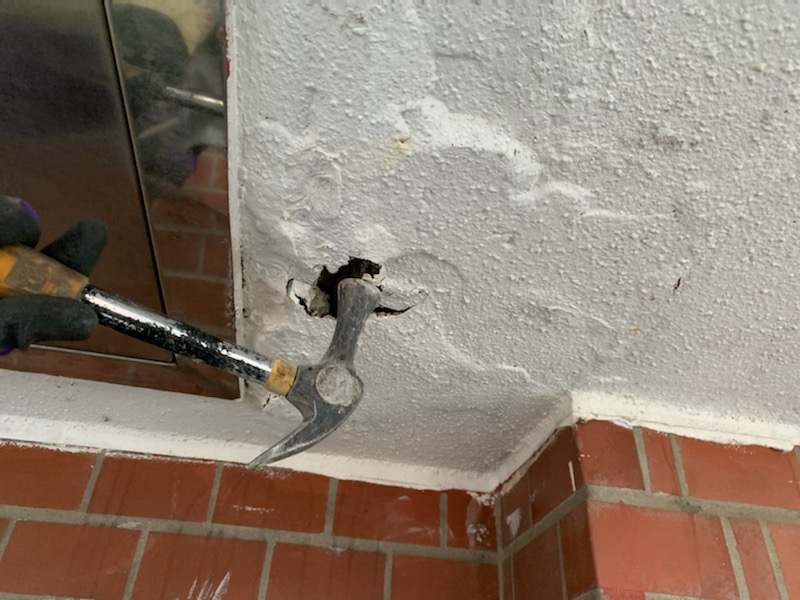 ハンマーでモルタルを解体すると中から腐食した鉄筋が出てきます。