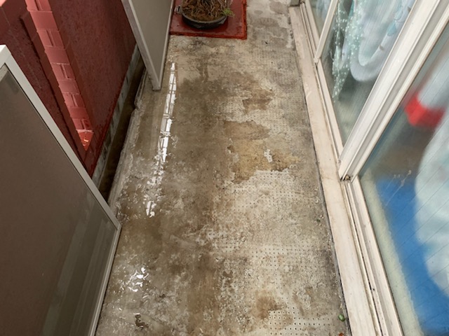 上の階のベランダの防水状況が悪く、雨水が浸透してしまっているからだと思われます。