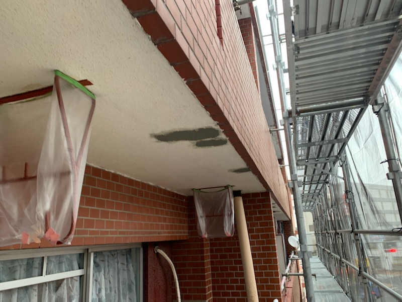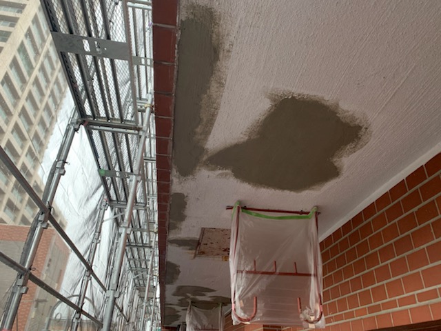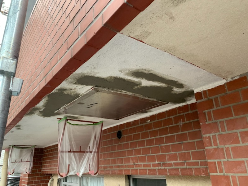 手摺の塗装が完了したので、ベランダの天井に発生している爆裂を解体して腐食した鉄筋に錆止めを塗布しておきました。