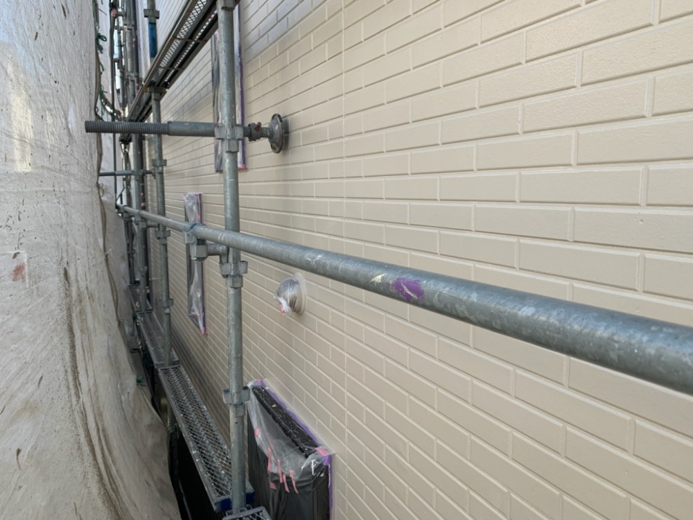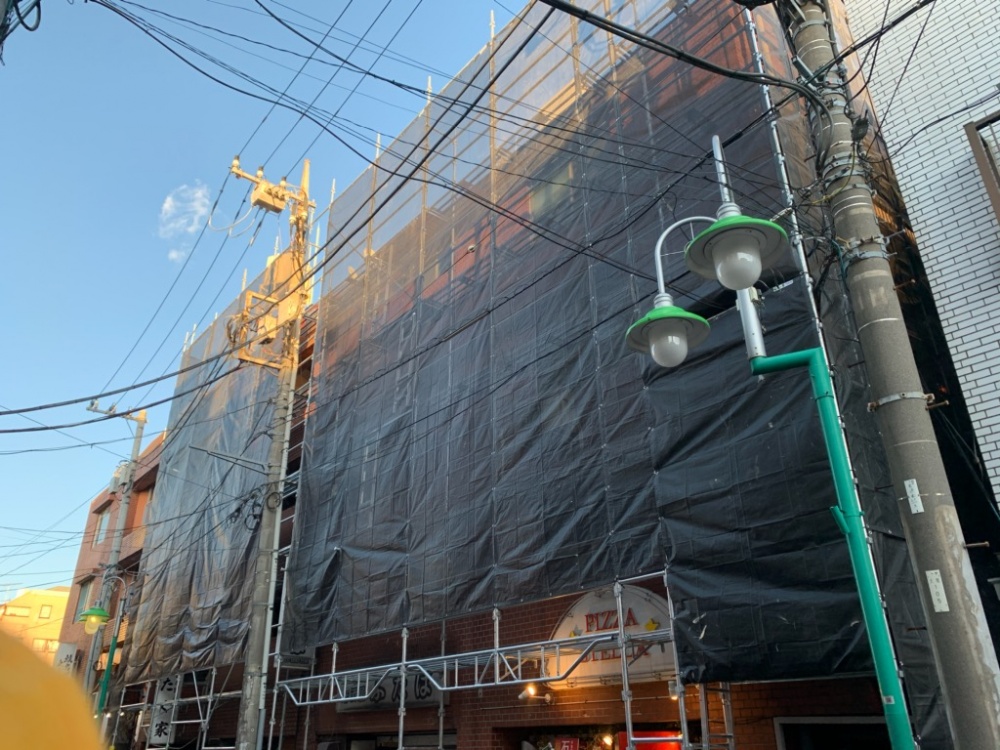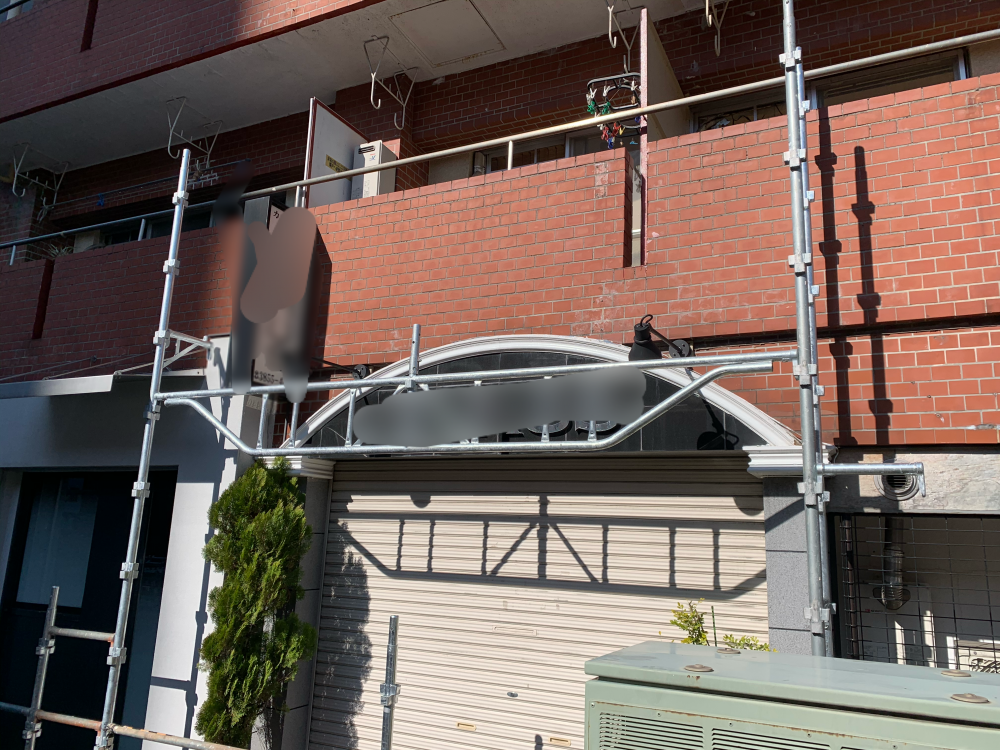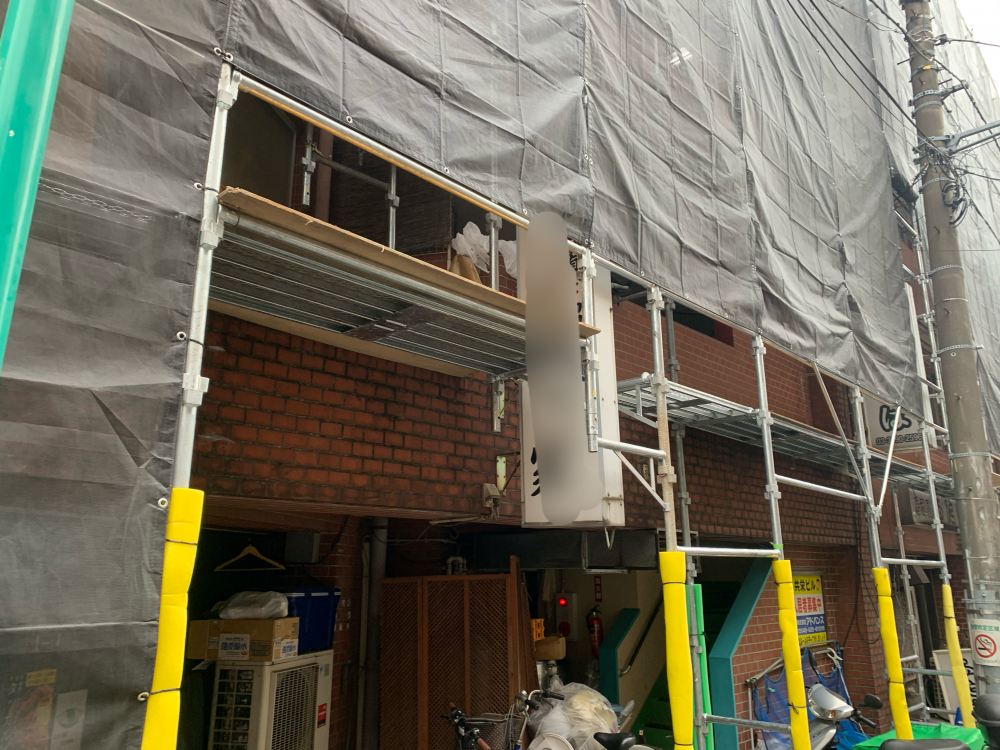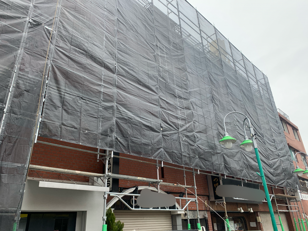 まずは足場の架設から始まりますが、店舗が営業したままの工事になりますので、工事の影響を最小限にして工事を進めていかなければなりません。