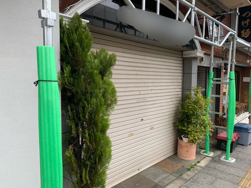 飛散防止の養生をしますが、なるべく店舗看板が隠れないようにしていきます。
