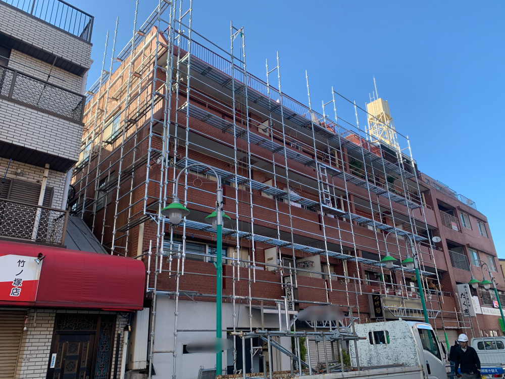 足立区竹の塚の集合住宅外壁塗装/店舗前の開口足場