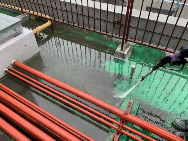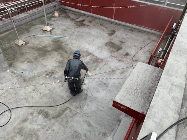 作業は進めていくしかないのですが、道路に誘導員を配置し通行人を誘導するのはもちろんですが、セイルズではなるべく雨天時に高圧洗浄清掃を施行させて頂いております。