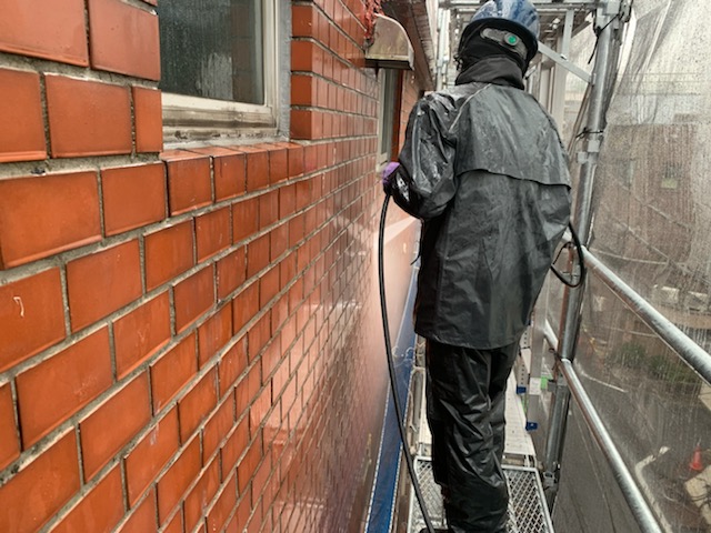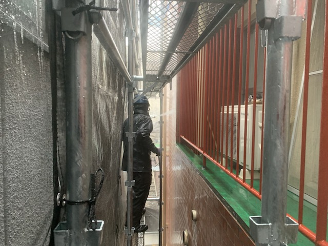 外壁に付着した汚れを落としてから工事に入っていきます。