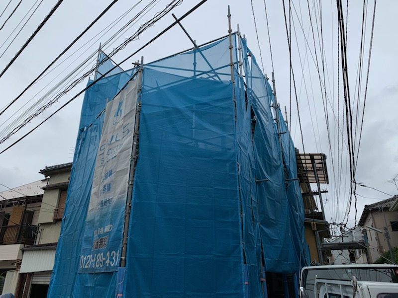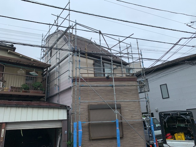 只今施工中の台東区根岸の現場ですが、架設足場をギリギリに設置しての施工ですのでかなり作業スペースが狭くなっております。