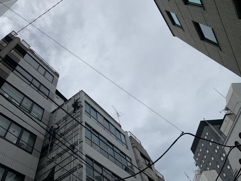 天気は何とか大丈夫?中央区日本橋の外壁塗装工事が完了して足場の解体中