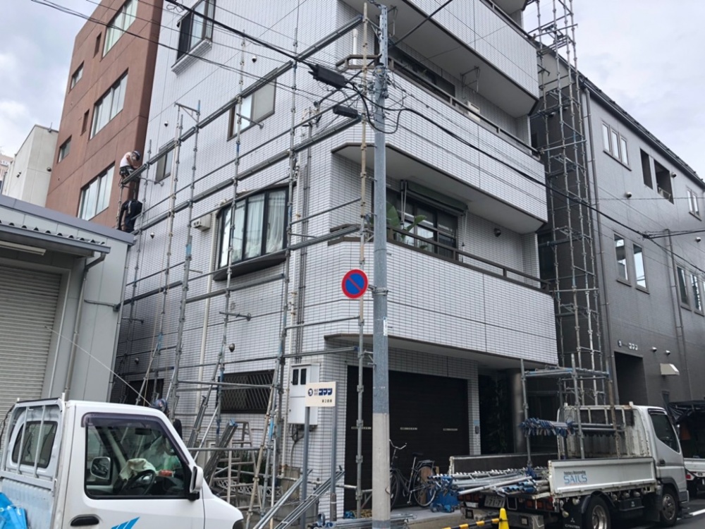 中央区東日本橋の外壁塗装工事ですが、雨で予定が数日遅れましたが何とか施工が完了して本日足場を解体しております。