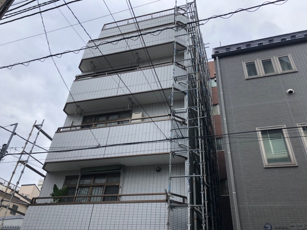 荒川区東日暮里で外壁タイルの改修工事が始まります。両側壁面の2面の工事になります。