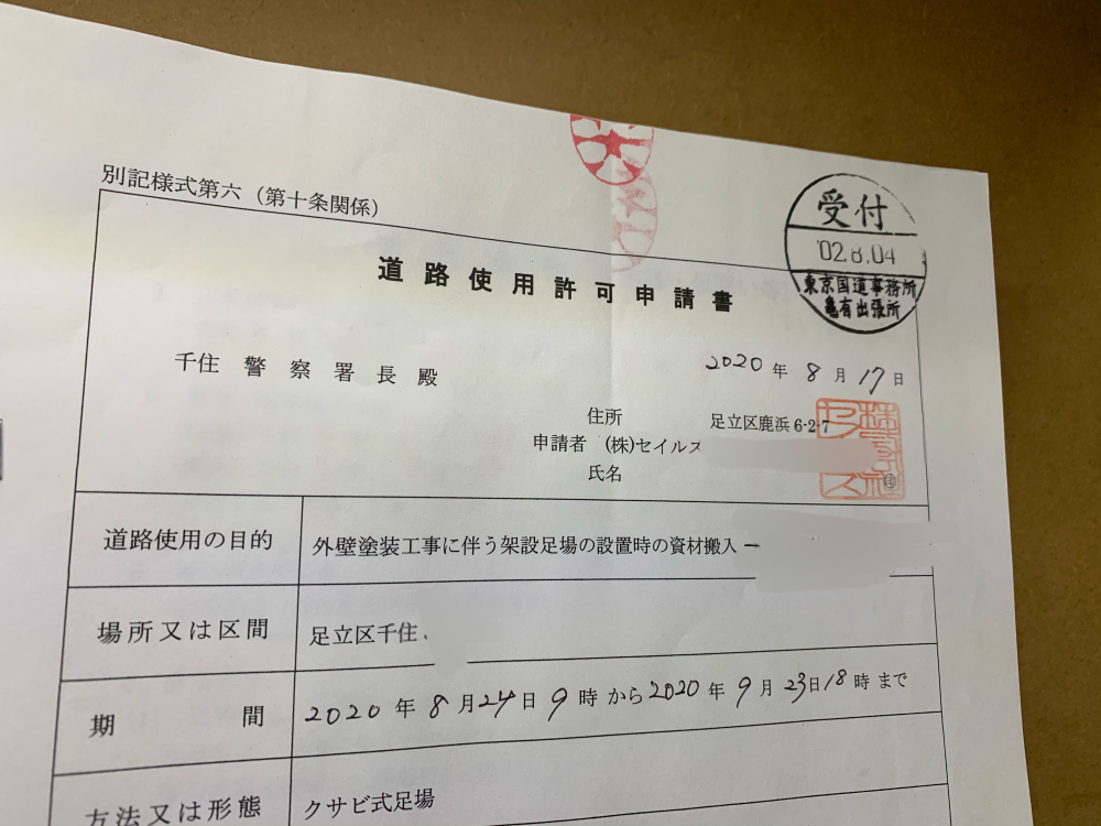また併せて足場の架設時には道路にトラックを停めて資材を搬入しなければなりませんので、道路を使用する許可申請が必要になります。