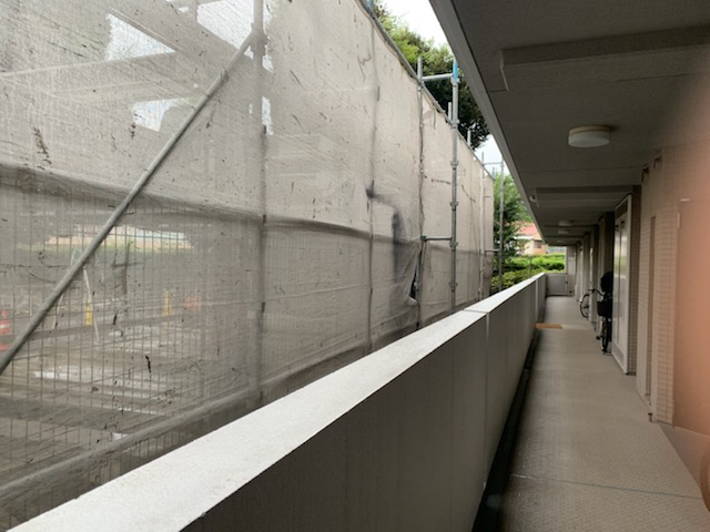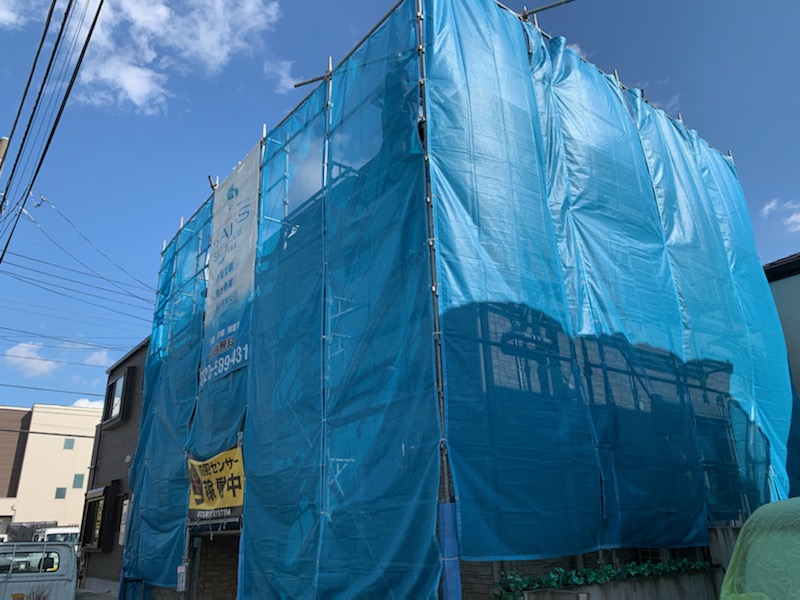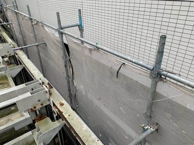 飛散防止の為足場を架設してメッシュシートで養生をします。