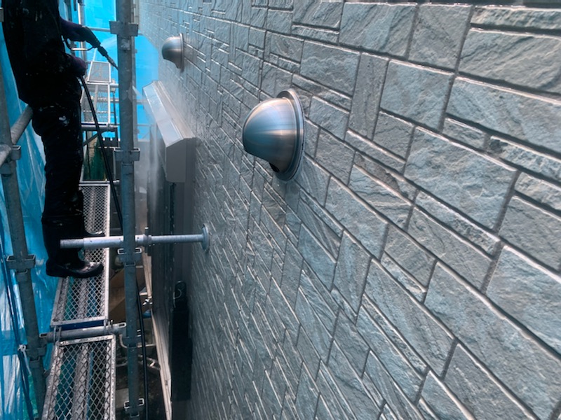 高圧洗浄は洗浄機を2台使用して長年蓄積された土や汚れを洗い流していきます。