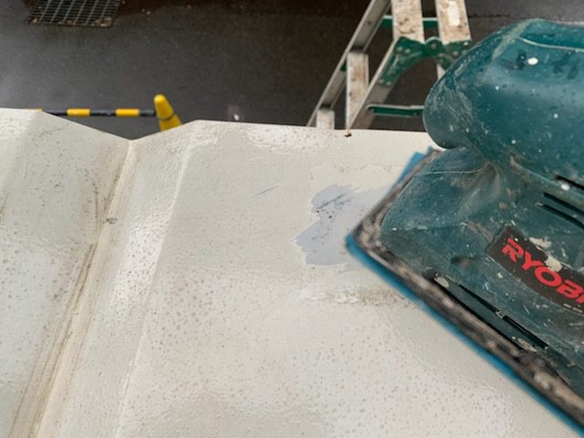 交換する車両ナンバーのステッカーを撤去した場所はペーパーサンダーで糊や塗膜の段差をきれいにしていきます。