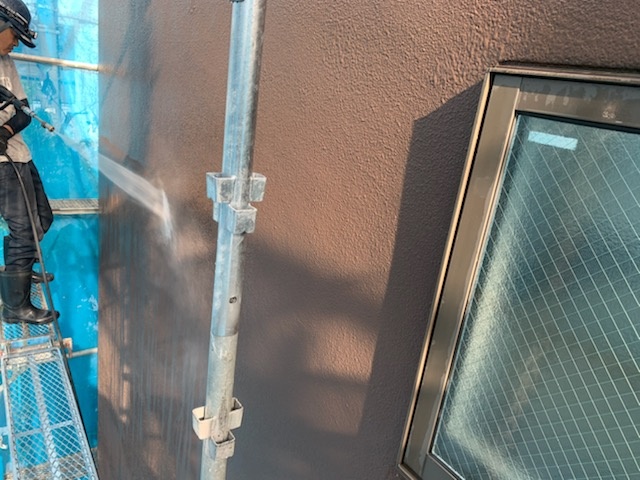 本日は架設足場設置後にまず最初の下地工事の高圧洗浄清掃を施工しておきます。