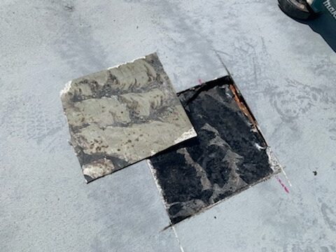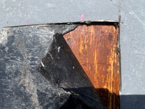 下地の浮きを剝がしてみるとFRP防水の下地にアスファルト防水が施工されております。
