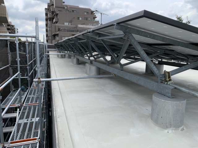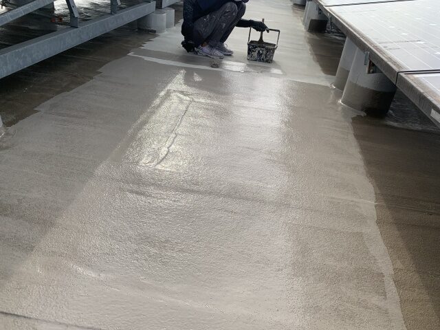 このように太陽光などが後から設置されている場合にはアスファルト防水での施工がしにくい状況ですので、塗膜防水のように細かい隙間にも塗布できる改修方法の方がしっかりと防水塗膜を付けることができると考えております。