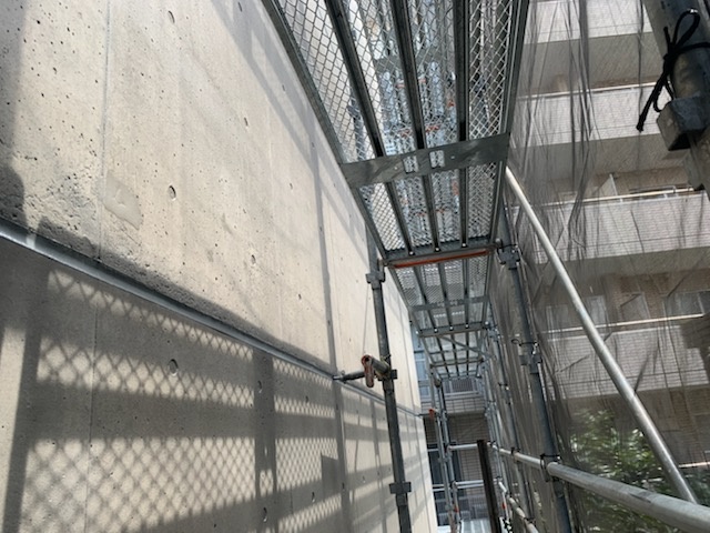 そこで今回はコンクリート打放し保護工法で、コンクリ打放しの良さを損なわずに雨水の浸透を防いでいきます。