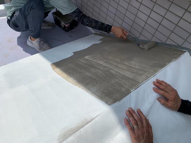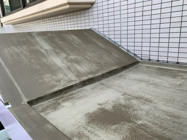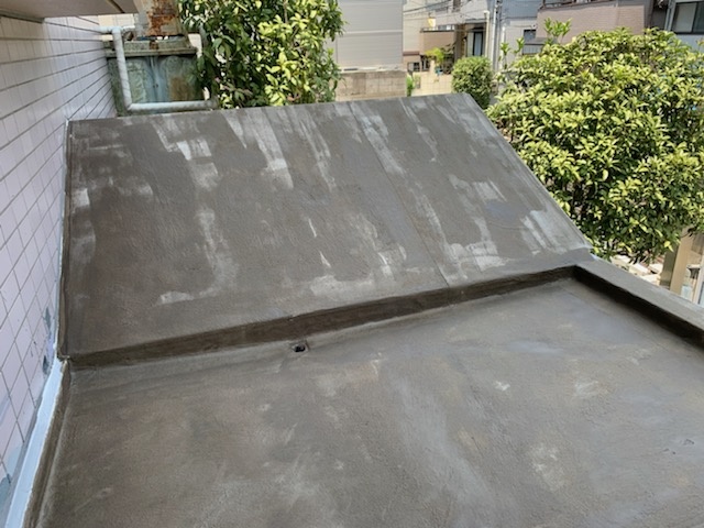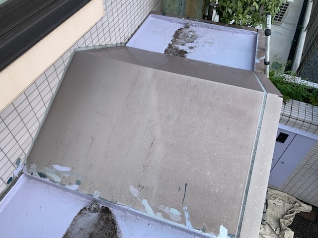 お客様がご自身で施工された既存の防水が水性系の防水材であると思われる事と、金属にも密着性の高い水系のポリマーセメント防水材で施工していきます。