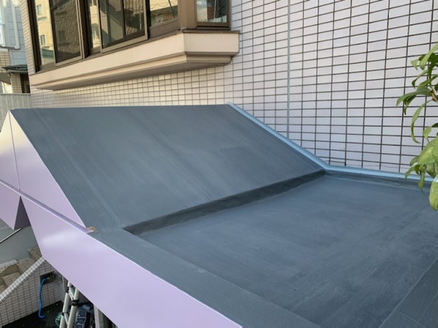 出隅や入隅が多く金属の為気温で下地が伸縮しやすい屋根には破断を抑制するため補強メッシュを貼って防水を塗布していきます。