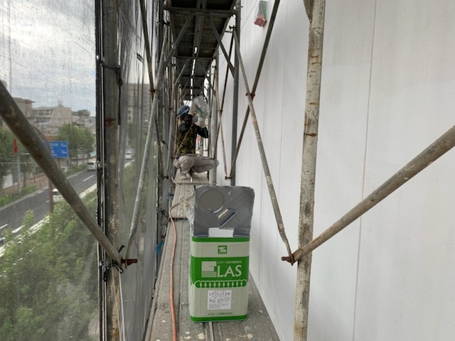 下塗り、弾性塗料の吹付が完了している外壁の仕上げ塗装になります。