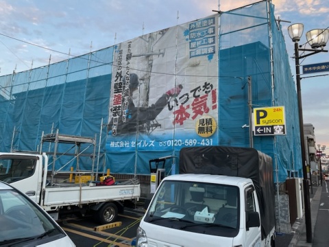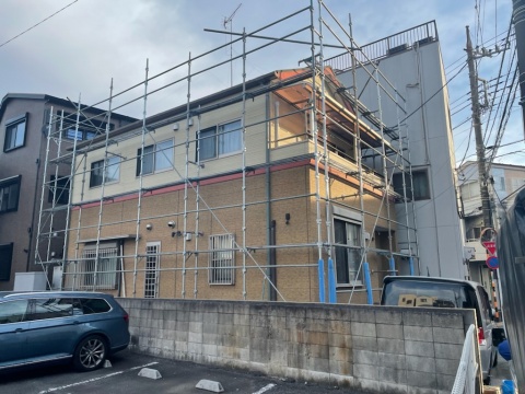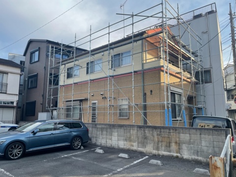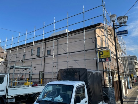 隣地コインパーキングを使用させて頂き足場の架設足場をお考えのお客様必見/足立区本木の屋根塗装工事