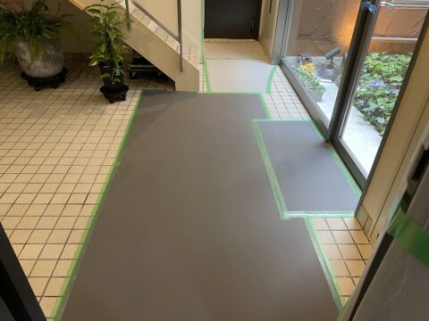 まず初めに資材の仮置き場と今回使用させて頂く建物内の搬入経路を養生させて頂きました。