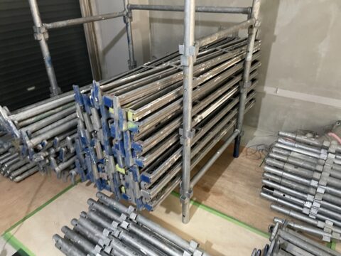 施工方法は柱が立つと横移動が難しくなってしまいますので、施工→足場→施工→足場を繰り返していきます。