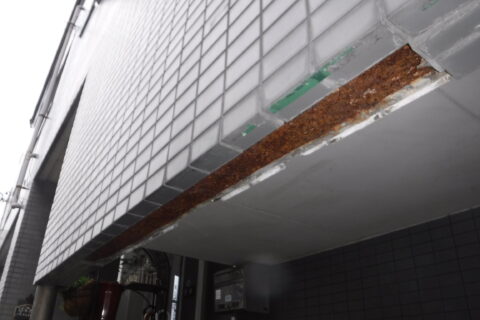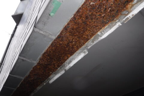 今回の場合は後者の可能性が強いと考えられ、タイル目地より侵入した雨水が一番下の鉄骨に溜まってしまい腐食がどんどん進行してしまったのではないかと考えられます。