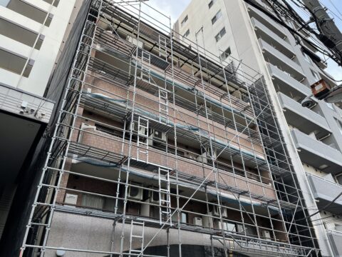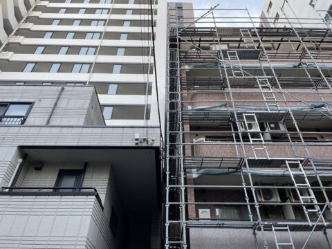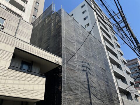 隣地敷地が狭小の外壁塗装工事もお任せください!!荒川区西日暮里の集合住宅の外壁塗装工事がはじまりました。