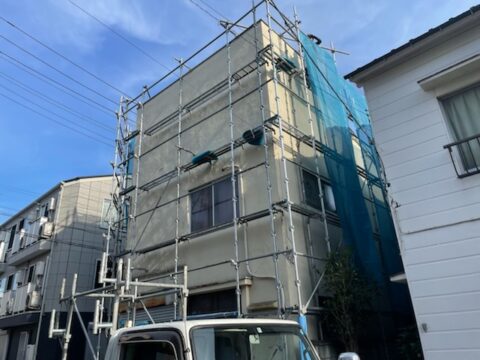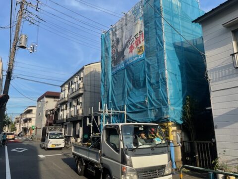 ⇒隣地の敷地スペースがある場合には事前に敷地へのはみ出しを依頼して十分なスペースを確保して足場を架設していく。
