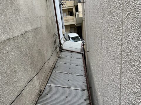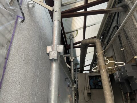 波板屋根に足場の箇所に穴を開けさせて頂いて足場の架設を行いました。
