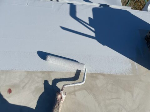 昨日屋根の防水工事の施工が完了しておりますので、本日は仕上げの保護塗装をしていきます。