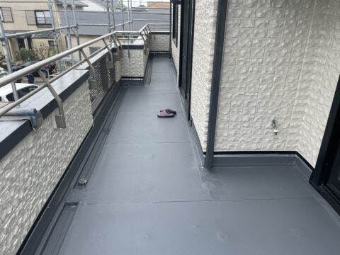 本日ベランダの塩ビシート防水が完了し、お客様と工事の点検をさせて頂き、足場の解体が完了し、お引き渡しをさせていただきました。