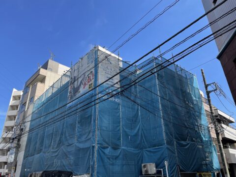 電気屋さんからのご依頼で設備工事の為に7階建てのビルの工事面に足場の架設