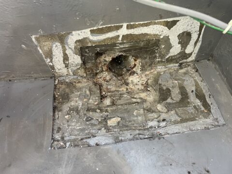排水口周りの既存の改修ドレンの破損により発生したと思われます。
