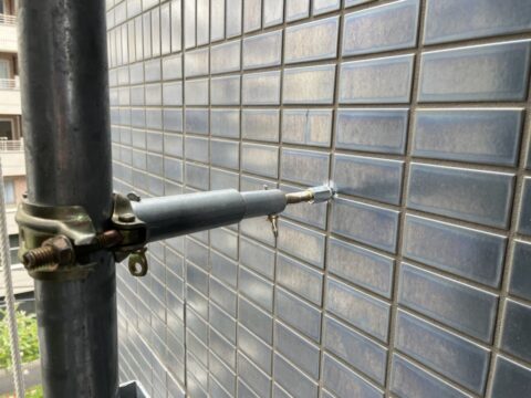 今回の外壁がタイルの為、タイルをなるべく傷つけずに足場の架設をしたいということで、タイルの目地を使用してアンカーを打診するのですが、数を増やして強度を保つようにしております。