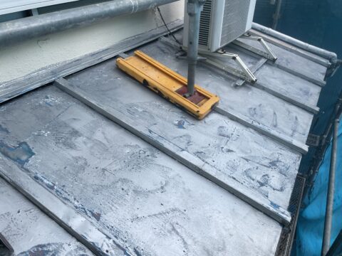 屋根をお客様が何度か塗装を行っておりますが、塗膜の厚みにむらがあり、塗料もどんな塗料を使用しているかも不明です。