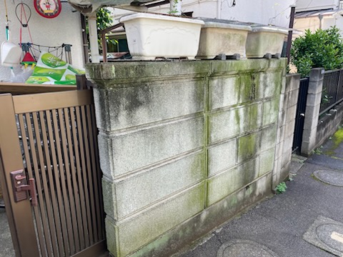 玄関廻りのブロック塀がコケや藻で汚れている@高圧洗浄清掃でブロック塀の洗浄