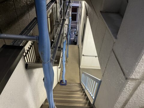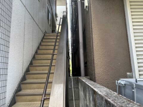 狭い場所は狭間用の足場部材を使用し、階段は通行ができるスペースを確保してしっかりと架設足場を設置させて頂きました。