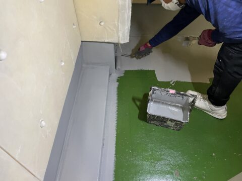 防水はポリマーセメント系の防水材「セレタック」を2回塗布して完了になります。