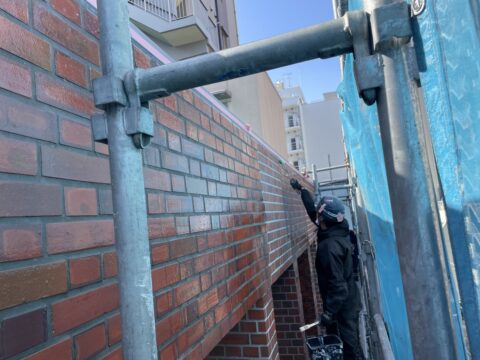 今回はタイル面のみの施工で、足場も1面のみ架設しての工事になります。
