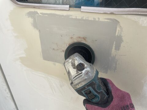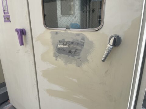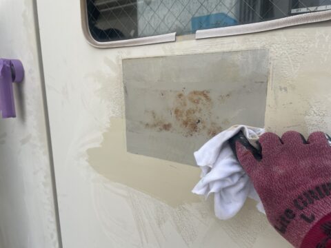 劣化したステッカーは塗装後に新しい物を貼ってもらいますので撤去しますが、古い物は糊が残るのでシンナー拭きをして糊を落とします。