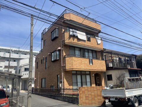 タイル張りの外壁で、正面の外壁は数年前に工事を行っており、今回は残りの3面の施工になります。