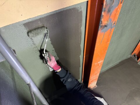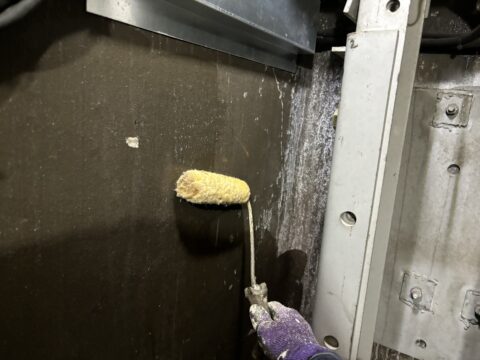 セレタックという水系の防水材で防水をしていきます。水系ですので臭気も少なく、エレベーターピット内でも安全に作業を行う事が可能です。