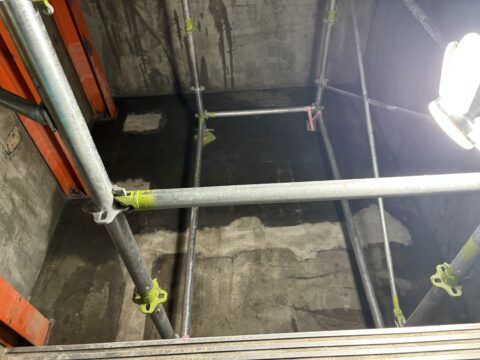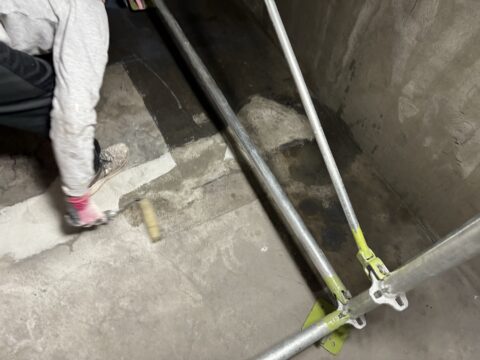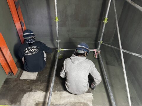 先日エレベーターピット内の洗浄が完了しており、本日は防水工事を行っていきます。
