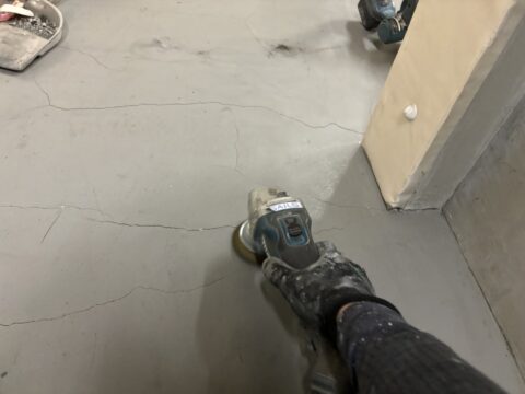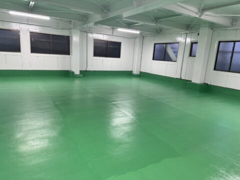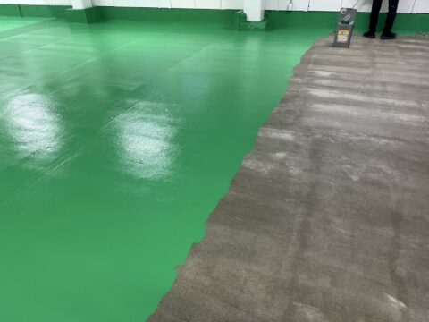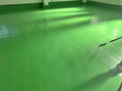 ひび割れ等もカバーされ綺麗に仕上がりました。耐久性の高い塗床塗装は足立区鹿浜のセイルズにお任せください!