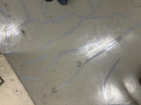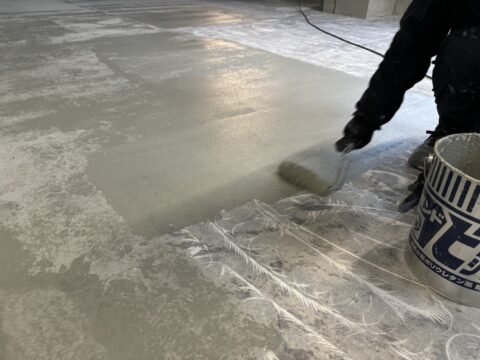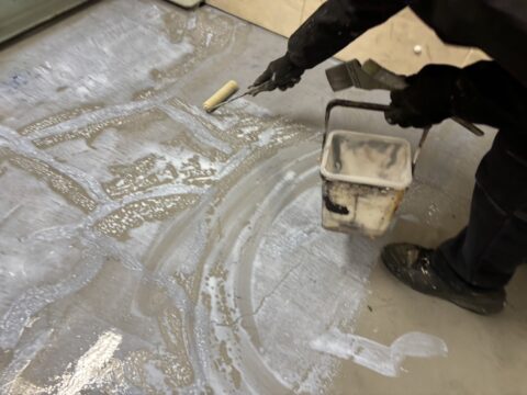 もともと床が塗装してあり、劣化や摩耗ではがれている部分がある場合はカチオンを使用して凹凸を目立たなくしていきます。